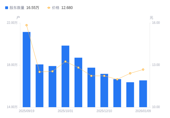 1月14日动静,数据显示,截至2026年1月9日,江山智能A股股东总户数为16。55万户,较上期(2025年12月31日)添加1799户,增幅1。10%。公司最新A股总股本为10。75亿股,此中畅通A股10。73亿股,户均持有畅通A股数量为6483。09股,较上期削减71。26股,降幅1。09%;户均持畅通A股市值8。22万元,较上期添加866。06元,增幅1。06%。
