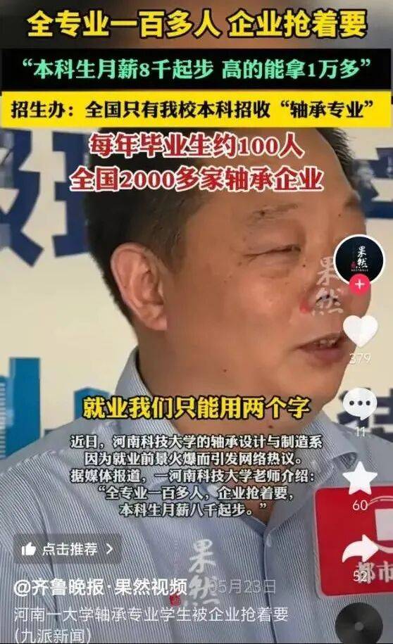 按照学校教员所说,目前全国高校中只要河南科技大学正在本科阶段开设轴承设想取制制专业(标的目的),每年结业生只要100多小我,而全国有2000多家轴承企业,因而结业生一曲都是“求过于供”。
