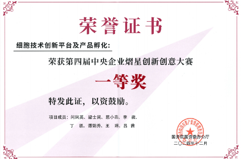 和创生物细胞取基因医治产物研发平台项目获得国务院国资委“第四届地方企业熠星立异创意大赛”一等。