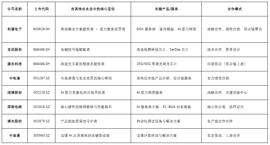 这八家公司——利通电子、龙迅股份、源杰科技、中电港、鸿博股份、深南电、博杰股份、中富通——并非英伟达的子公司,而是通过正在供应链、分销渠道、手艺合做、办事使用等分歧环节取英伟告竣立的慎密联系,深度融入其价值链,并成为分享AI时代盈利的环节参取者。它们各自由财产链中饰演着不成或缺的脚色,从上逛焦点元器件供应,到中逛的出产制制取测试,再到下逛的系统分销取算力办事,配合形成了一幅英伟达正在中国营业拓展的全景图。